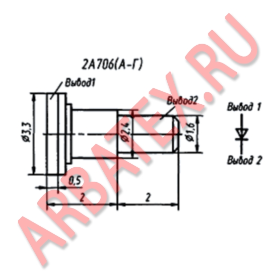 Диоды маркируются цветной точкой на торце вывода 2: 2А706А - красной, 2А706Б - белой, 2А706В - черной, 2А706Г - синей.