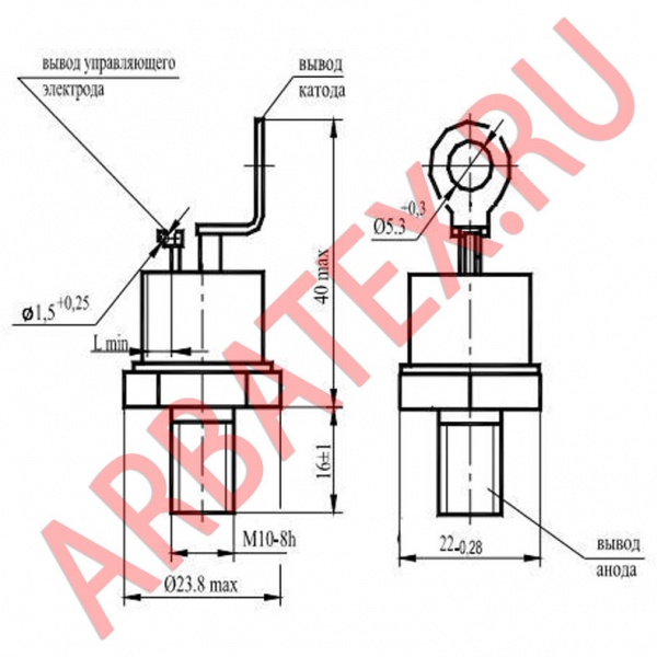 Основание тиристора является анодом, жесткий вывод - катодом.